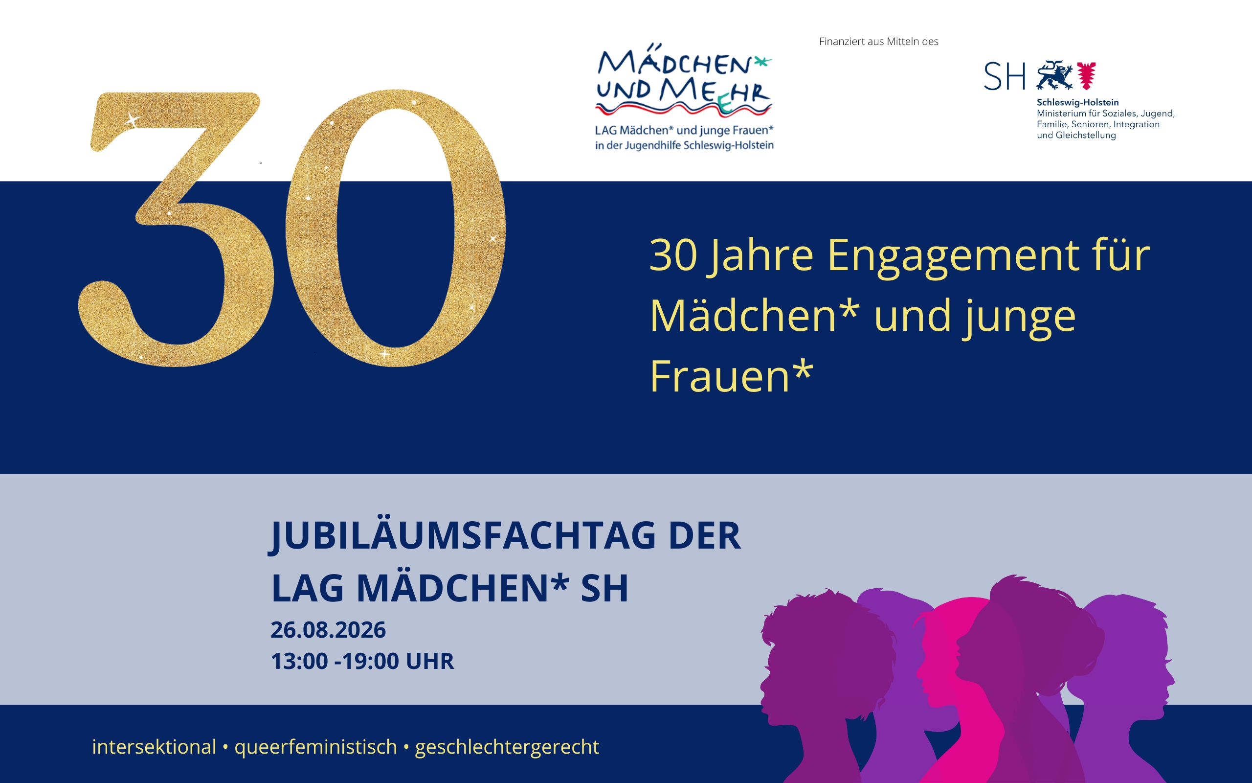 26.08.2026: Jubiläum der LAG Mädchen*: 30 Jahre Engagement für Mädchen* und junge Frauen* in Schleswig-Holstein – Sozialministerium in Kiel voraussichtlich 13:00 -19:00 Uhr - weitere Informationen folgen in Kürze